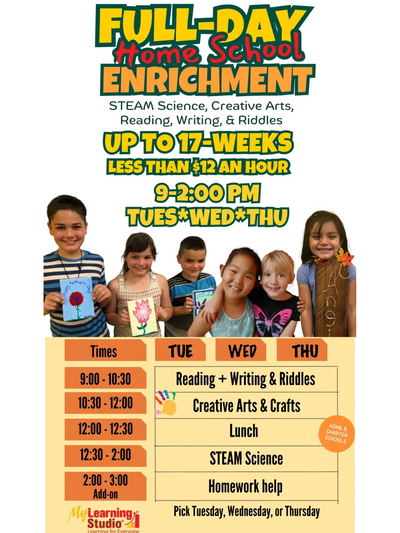 Whether you’re a budding artist or a curious scientist, we’ve got something interesting and intriguing to tantalize your mind. My Learning Studio Enrichment Classes are always small groups to ensure engagement in a fun, educational, and structured safe environment for all students. Occasionally, we might include a kinder as long as they are independent and able to keep up with the class or 6th grade sibling,